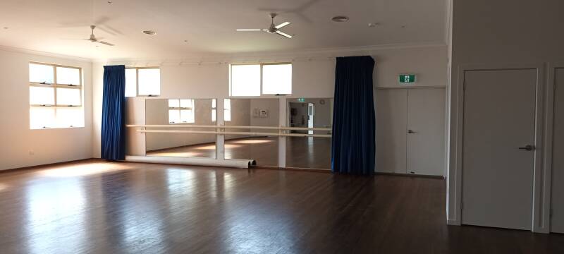 The hall features polished floorboards, a compact stage, and a full-length mirrored wall. It offers an ideal, air-conditioned venue for hosting private functions, celebrations, large group classes such as dance or exercise sessions, exhibitions, and community events. Trestle tables and chairs are available to accommodate various layouts.